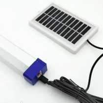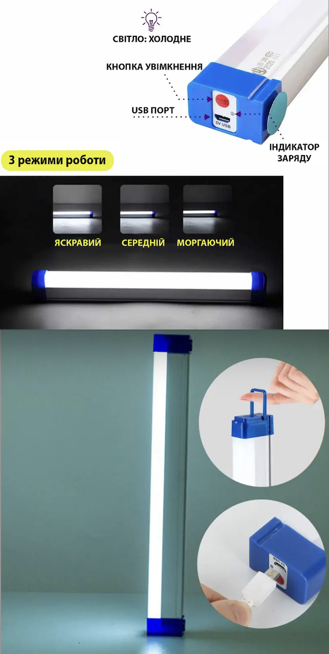 Легка світлодіодна лампа завдовжки 30 см в пластиковому корпусі, не нагрівається, заряджається від сонячної панелі, мережі 220 В або USB пристроїв. Має вбудований акумулятор. Час освітлення - до 10 годин при повній зарядці.